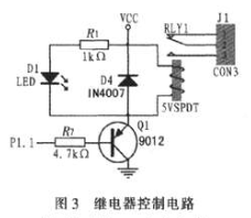 繼電器電路如圖3所示,圖中P1.1引腳用于控制加熱繼電器。給P1.1低電平,三極管導(dǎo)通,電磁鐵觸頭放下開始工作。