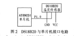 溫度采集模塊主要完成對環(huán)境溫度數(shù)據(jù)的采集和轉(zhuǎn)換,并將采集到的溫度數(shù)據(jù)送給處理器。該模塊選用數(shù)字溫度傳感器DS18B20。數(shù)字溫度傳感器DS18B20是美國DALLAS公司推出的一種改進(jìn)型智能溫度傳感器,能直接讀出被測溫度值,可利用串行方式與單片機(jī)實(shí)現(xiàn)通信,且僅占用一條數(shù)據(jù)線,僅需要一個端口引腳進(jìn)行通信,因此從主機(jī)CPU到DS18B20僅需一條線連接,而且DS18B20的電源可由數(shù)據(jù)線本身提供(相對于外部電源,轉(zhuǎn)換時間要延長),占用單片機(jī)資源少;每一個DS18B20在出廠時已經(jīng)給定了唯一的序號,線上,實(shí)現(xiàn)多點(diǎn)組網(wǎng)功能;是數(shù)字傳感器,送入單片機(jī)的數(shù)據(jù)為二進(jìn)制數(shù)據(jù),無需A/D轉(zhuǎn)換,便于處理,大大加快了微處理器的運(yùn)算速度。DS18B20的測量范圍從-55~+125℃,增量為0.5℃(最高精度可達(dá)0.1℃),轉(zhuǎn)換速度小于1 s(典型值)。與單片機(jī)的連接方式如圖2所示。